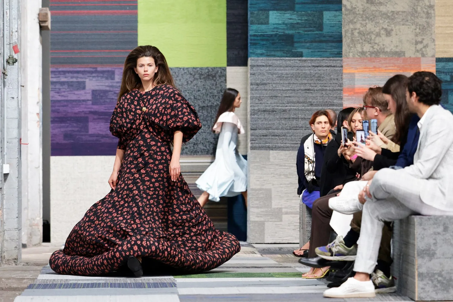 Then came the first show of the season: Jordan Dalah, Central Saint Martins graduate and rising sartorial star – who opened with a bang. Models not so much strutted but strode the maze-like catwalk to the deep vibrating beats of Mitchell Tolman, dressed in high-impact hooped skirts, bulbous gowns, puffy sleeves that could double as pillows, dresses decked out with larger-than-life bows and avant-garde headwear.