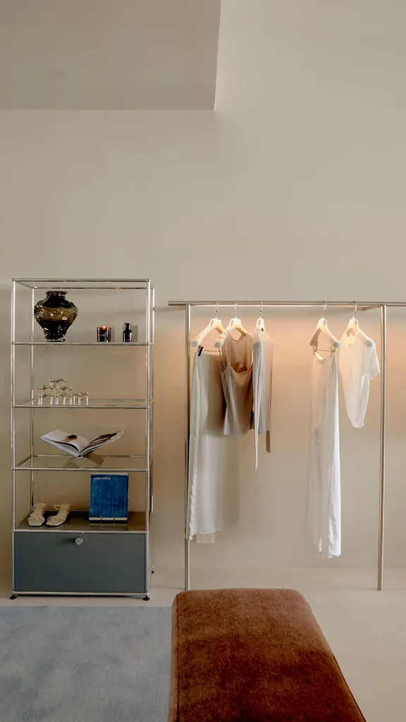 Bathed in natural light, the clean, minimalist space is a juxtaposition of contemporary design and thoughtfully curated vintage pieces. The lined brushed silver finishes and statement glass brick counter glistens alongside warm neutrals and luxurious fabrics made for shopping in style.